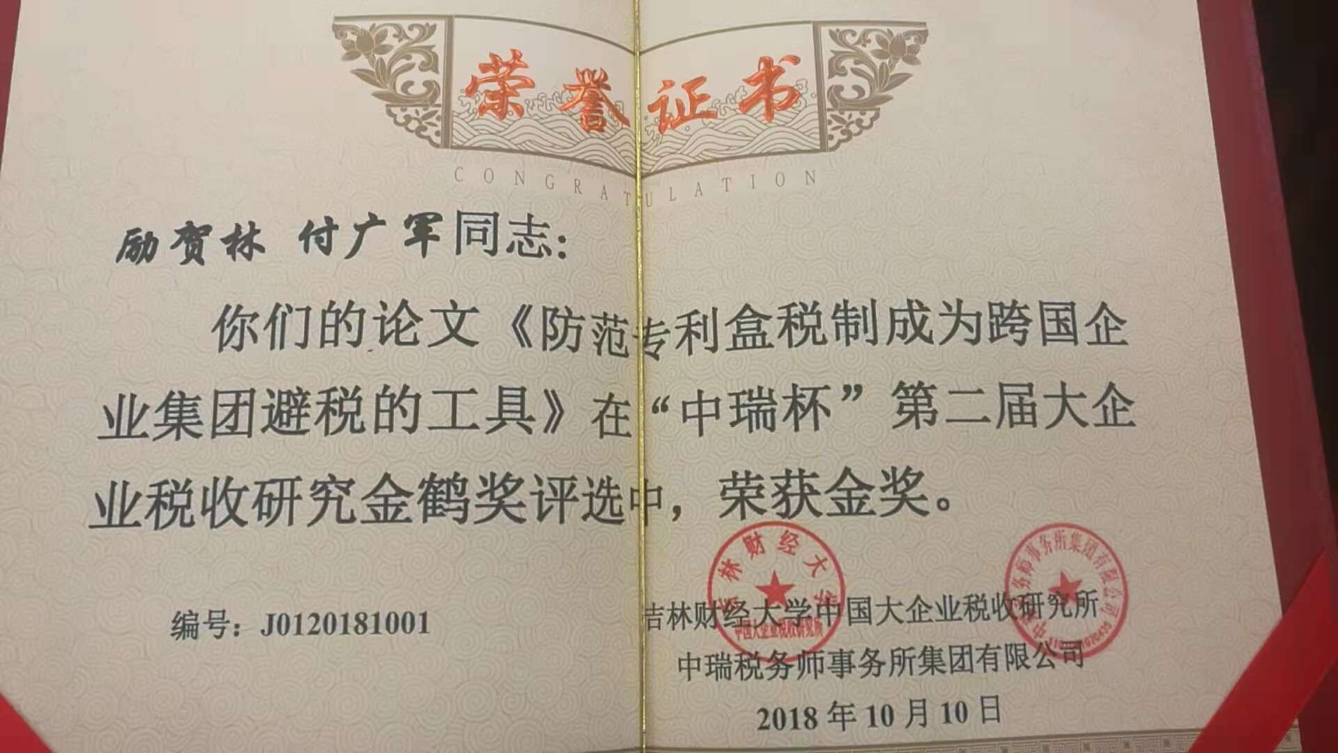 2018年10月14日,由吉林财经大学主办、中瑞税务师事务所集团有限公司承办的“‘中瑞杯’第二届大企业税收研究金鹤奖颁奖典礼暨征管体制改革影响分享会”在中国科技会堂成功举办。公司球报体育副经理励贺林与国家税务总局税收科学研究所研究员付广军合作的论文《防范专利盒税制成为跨国企业集团避税的工具》被评为“中瑞杯”第二届大企业税收研究金鹤奖唯一的金奖(第一届金奖空缺),全国政协委员、国家税务总局原副局长张志勇先生亲自颁奖。