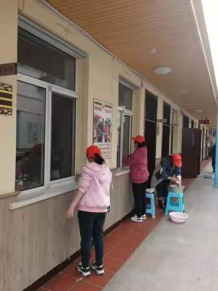 干净的窗户倒映着志愿者们勤劳的身影!