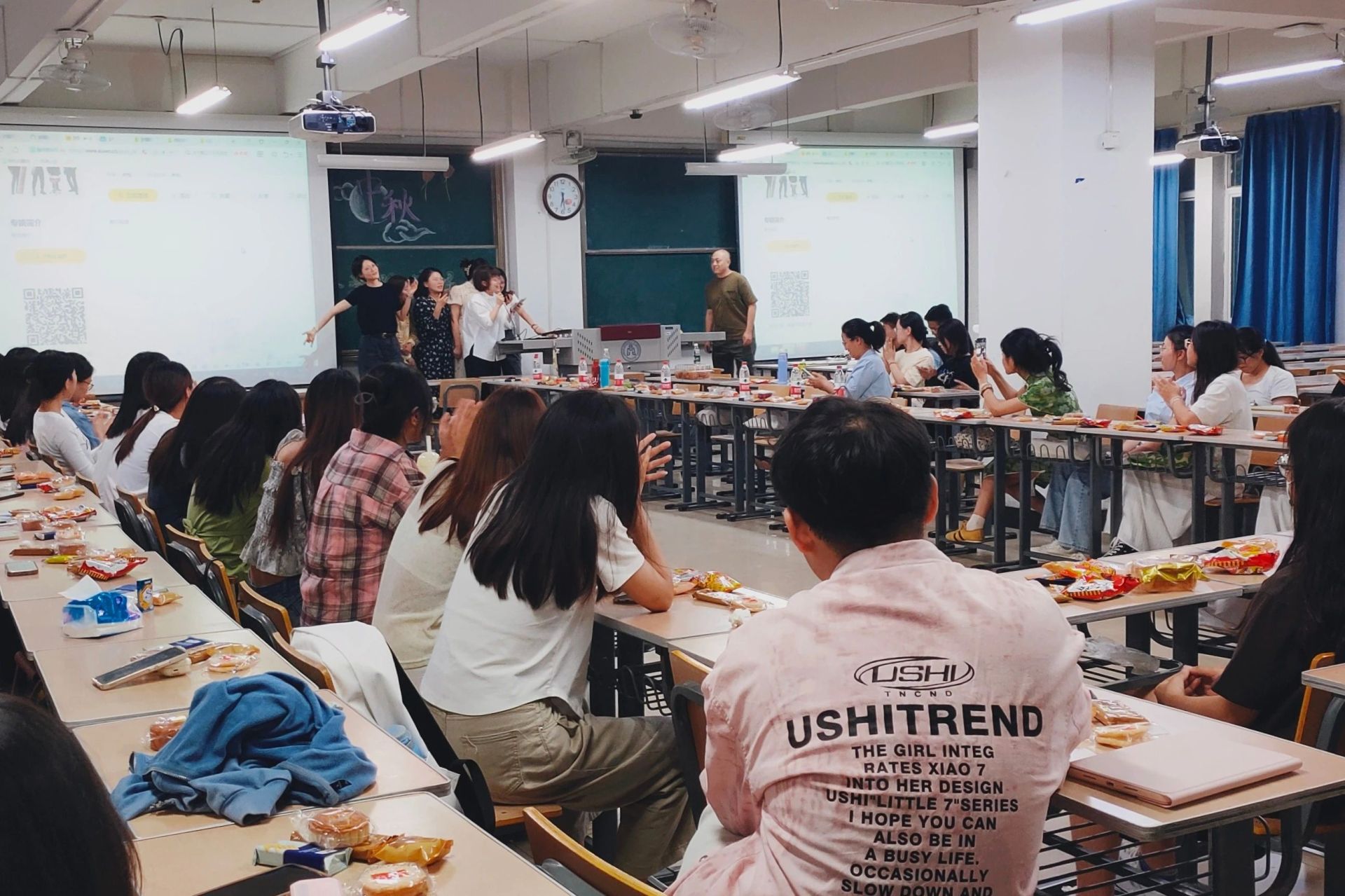 研究生新生们则共享了一场温馨而富有意义的中秋茶话会。老师们送出美好祝愿,并倾听同学们的心声,为同学们答疑解惑;同学们畅谈期许与心愿,在节日的浓厚氛围中明晰未来。茶话会期间,还穿插了有趣的团队游戏和节目表演,同学们积极参与,争相抢答问题,大家围坐一堂,脸上洋溢着喜悦的笑容,现场掌声不断,笑声连连。