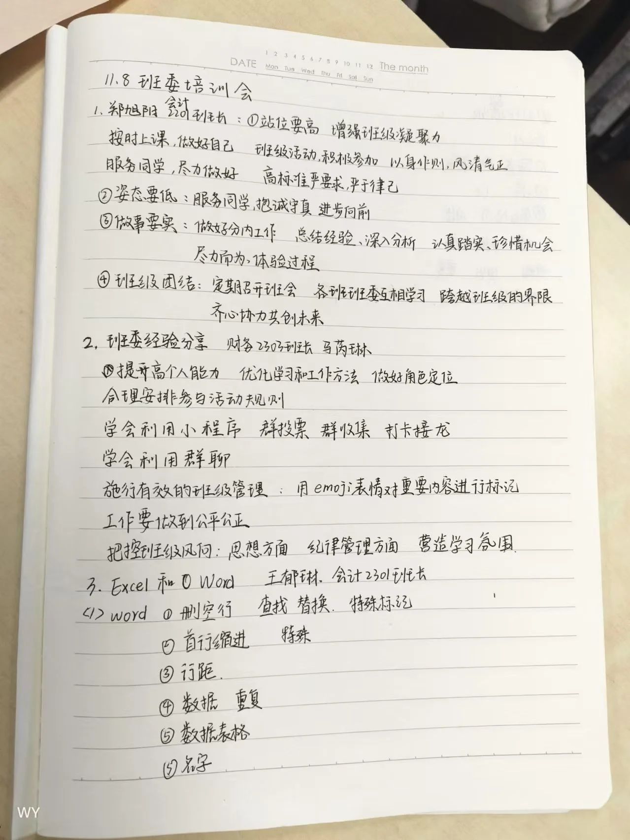 会计2301班班长王郁琳为班委们进行了Excel与word实操应用的培训,通过具体问题举例与基础操作演示,向同学们详细讲解了快速且便捷的解决方式,加强班委们对于办公软件的认识,有助于班委提高处理班级事务的效率。